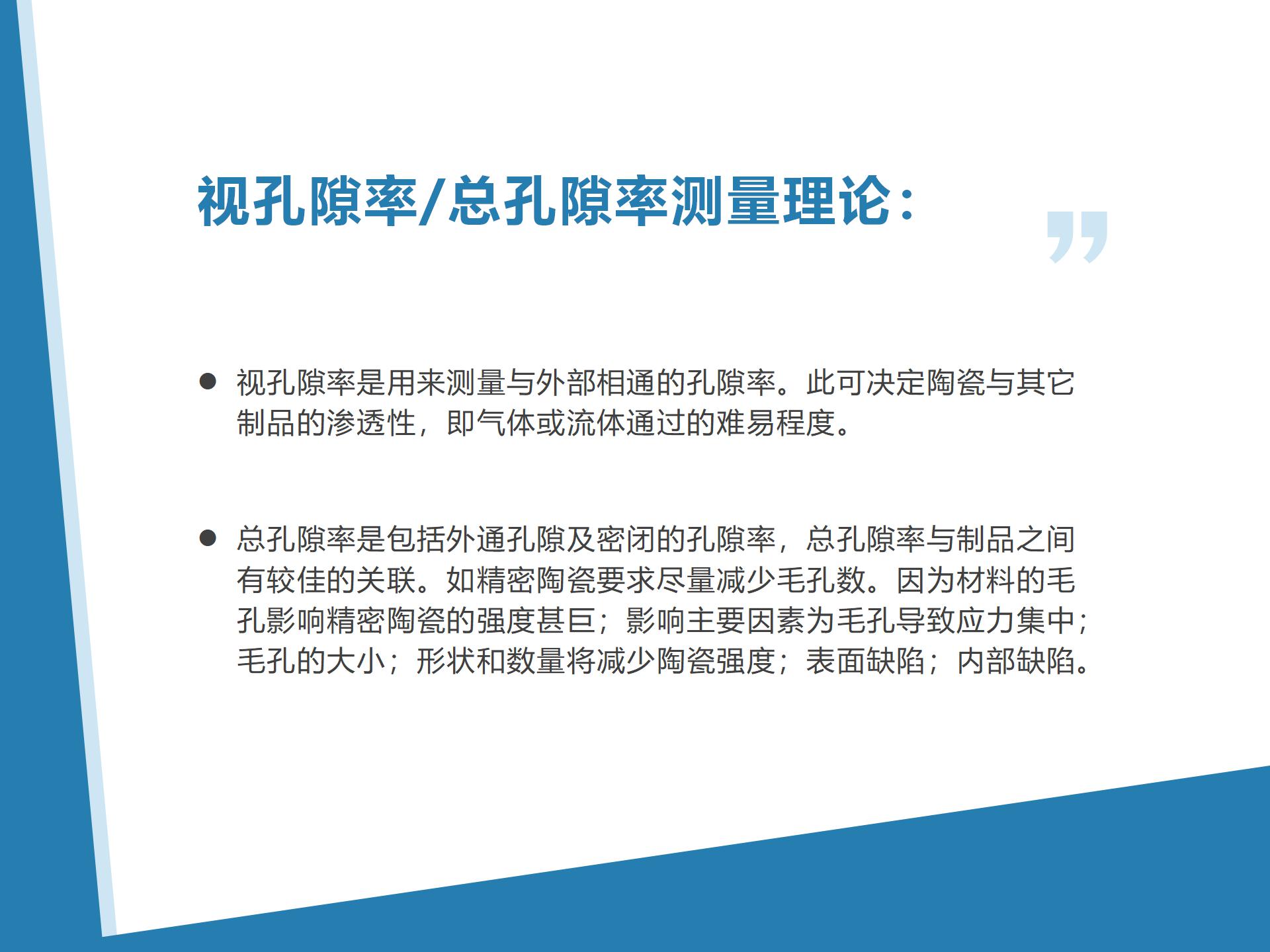總孔隙率測(cè)量理論:是包括外通孔隙及密閉的孔隙率,總孔隙率與制品之間有較佳的關(guān)聯(lián)。如精密陶瓷要求盡量減少毛孔數(shù)。因?yàn)椴牧系拿子绊懢芴沾傻膹?qiáng)度甚巨;影響主要因素為毛孔導(dǎo)致應(yīng)力集中;毛孔的大??;形狀和數(shù)量將減少陶瓷強(qiáng)度;表面缺陷;內(nèi)部缺陷。