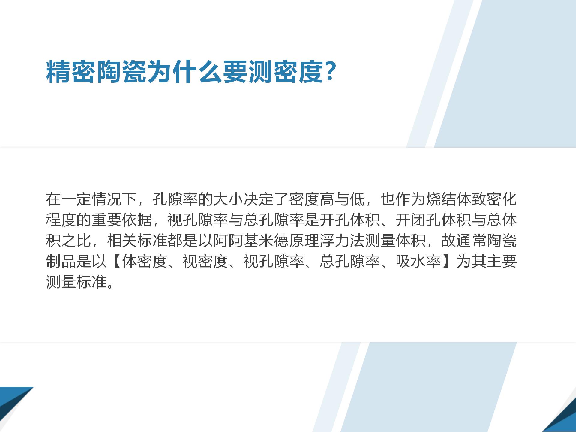 精密陶瓷為什么要測(cè)密度?在一定情況下,孔隙率的大小決定了密度高與低,也作為燒結(jié)體致密化程度的重要依據(jù),視孔隙率與總孔隙率是開孔體積、開閉孔體積與總體積之比,相關(guān)標(biāo)準(zhǔn)都是以阿阿基米德原理浮力法測(cè)量體積,故通常陶瓷制品是以【體密度、視密度、視孔隙率、總孔隙率、吸水率】為其主要測(cè)量標(biāo)準(zhǔn)。