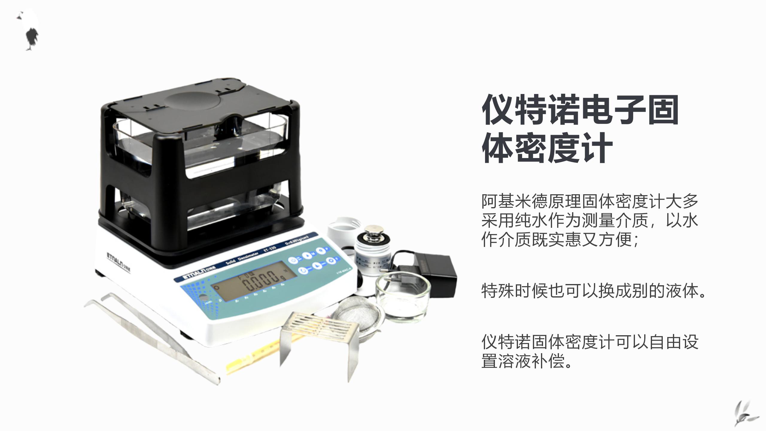 儀特諾固體密度計的其中一個亮點在于,它可以自由設(shè)置溶液補償,更換酒精、硅油等其它介質(zhì)來進行測量,這一設(shè)計為要測試的產(chǎn)品會溶于水的用戶提供了極大的便利。
